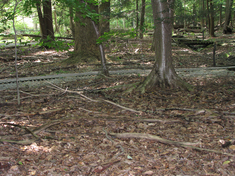 The alignment from this angle looks good for the right hand curvature of the wye. Looking down the track you can see how too much curvature in the left hand route of the wye will have to be reworked. |