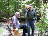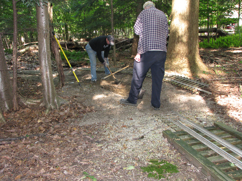 We had installed a switch just off the Justin Tyme Bridge for westbound traffic to cross over to get on to the Branch Line so today John Koontz and Frank Foti, under the supervision of Dick, are going to see if a wye switch that we had will fit in. Dick and Frank discussing the pros and cons of the fit. |