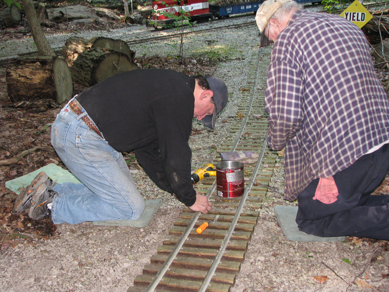 Ken Brooks and John Koontz carried the wye switch track panel back up to the Switch Shed and John started loosening up the screws that hold the rail down. John working on the rails for the left-hand route through the wye switch. |