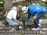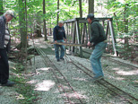 The tree roots, from the large tree on the opposite side of the track, have heaved the track up causing a noticeable bump for the trains going over it. Frank and Ken work on removing the rail joiner's from the track as it comes off of Bridge No.14. |