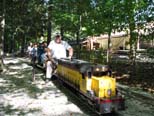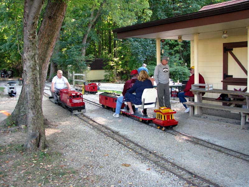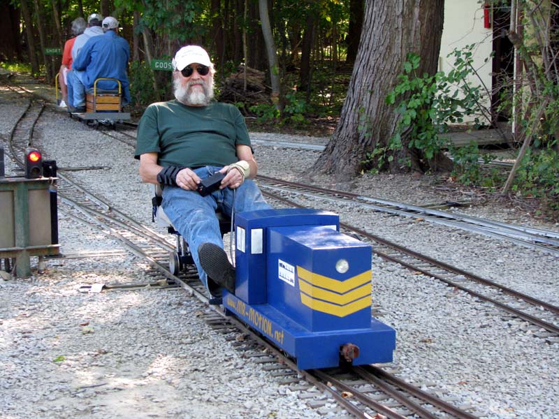 Bob waiting for the signal to clear at Hemlock with our two way running today. John Deptowicz with his Snoopy train has his riders all loaded and is about to depart from in front of the station. |