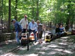 Things happen, Paul Emch straddles the car in Alex's train to help re-rail the car and will proceed soon with his train facing us. Larry Volzer and his wife Kathy thanking Dick for the ride and showing them our two way running with signals. |