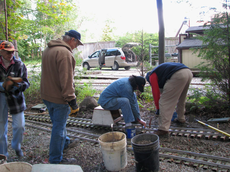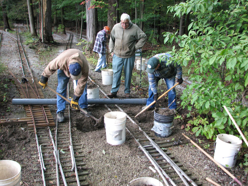 Need to add a switch on the left but decided that the water in the area needed to be aliviated. George Davidson, Tom Reder and Rick Nagy start trenching for the drainage pipe. |