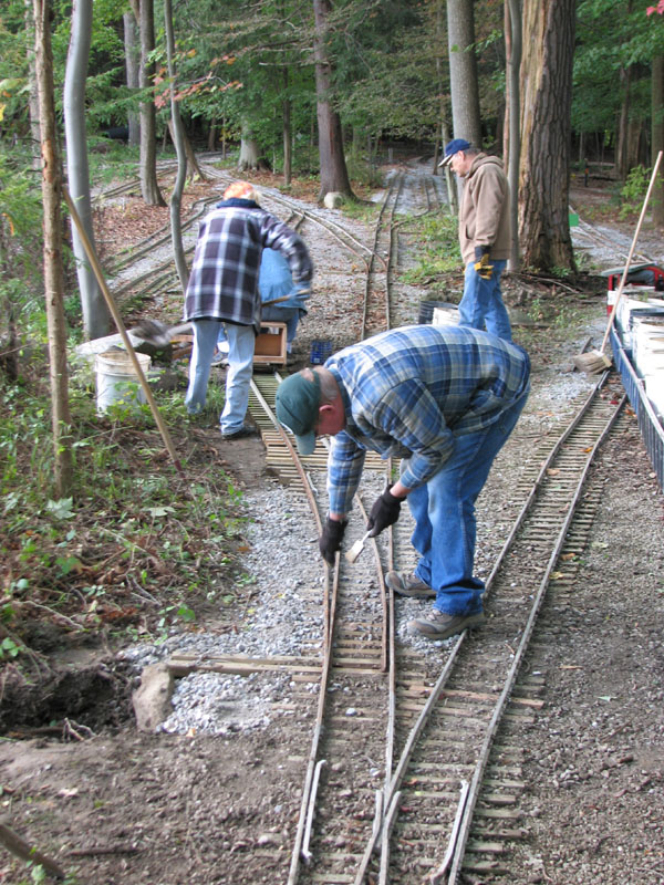 Rick cleans the ballast away from the points as Edith spreads ballast behind Frank and Tom takes a break. The finished trackwork with the new switch installed...all in a days work. |