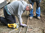 After our break it was back to work placing down the new rail to join the switch. Rick and Tom wait as Dick sights down the track to verify the curvature is right. |
