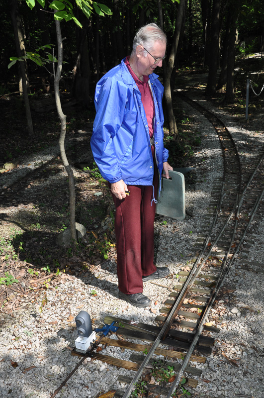 Ron Trenhaile replacing the LED bulb that he used in the small switch stand for the turnout that leads to Ted's Connection at Drudgery. Ron set up the switch with remote linkage that operates on a cam action to turn the signal light red when changing route otherwise it's a steady green. |
