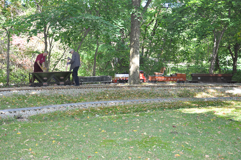 We had a very light turnout for trains today so Ron and Dick Clark are spreading ballast on the eastbound mainline behind the station. Ron watches the ballast spread along side of the track as Dick slowly moves forward with the train. |