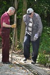 In reworking the track we got most of the kink taken out of it, it just needs a final tamping and a sweeping. George Metts in the background heads into the station to get a cup of coffee as Dick sitting in front of the station watches Ethan Deptowicz sprint off towards the train. |